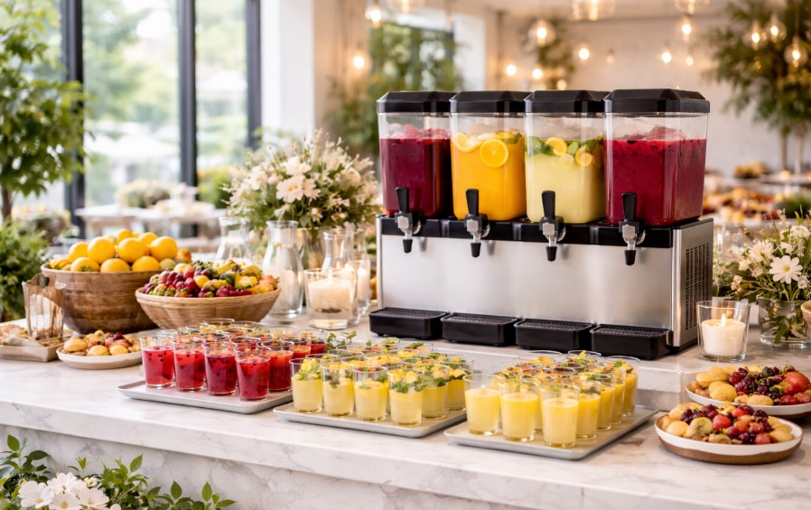 Tatlı, tuzlu ve kahvaltılık ikramlıklarının her biri, özel standlarda ve hoş sunumlu tabaklarda servis edilir. Aynı şekilde içeceklerin de yine dekoratif açıdan zengin detaylara sahip masalarda yer alması önemlidir. Soğuk servis edilmesi gereken içeceklerin ayrı ayrı şerbetmatik haznesine konulup masanın tam ortasına yerleştirilmesi idealdir. Göz hizasında olacak bir yükseklikte konumlanan şerbetmatik, serinliğin etkisiyle buz tutmuş haznesinde, sürekli karışan içeceğin sergilenmesini sağlar.